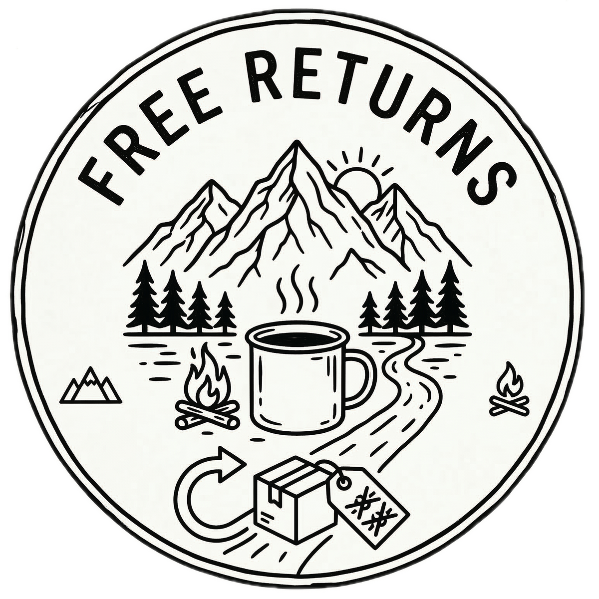 Circular logo with mountain, trees, campfire, and mug design, featuring 'Fast Shipping' text.